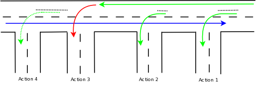 We need to read this picture from right to left (otherwise I would need to redo all the graphics ;)). In action 3, you see a 0-sized turning lane, aka an action queue in “direct” mode. All other queues are run in non-direct modes, but with different sizes greater than 0.